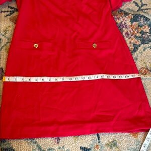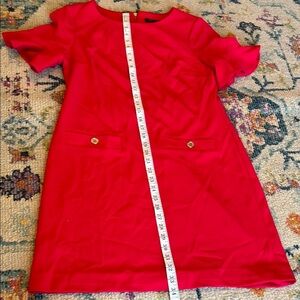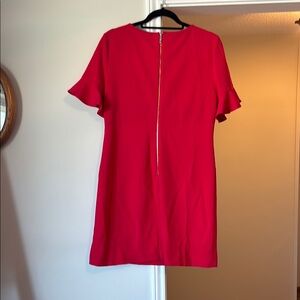 Elegant full coverage red dress with frill sleeves with zipper back. The dress has been hemmed at bottom but can be easily removed. I’m 5’4. The color is between a hot pink and red color. No stains