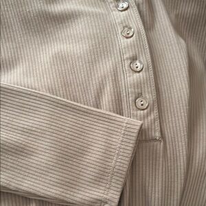 Elevate your wardrobe with this stylish ribbed button-up top. Perfect for any occasion, this tan top offers both comfort and elegance.