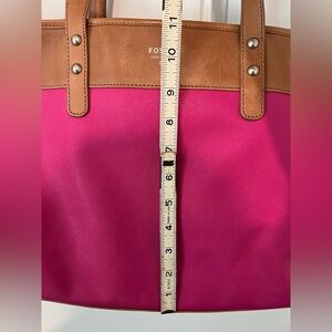 This Fossil tote bag showcases a vibrant pink body complemented by sturdy brown leather straps, offering a stylish and practical design. Its structured shape ensures durability and elegance, making it an ideal choice for everyday use. See pics for measurements.
