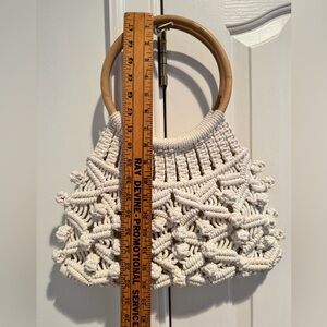 Stylish macramé bag in cream with wooden handles. Perfect for casual outings.