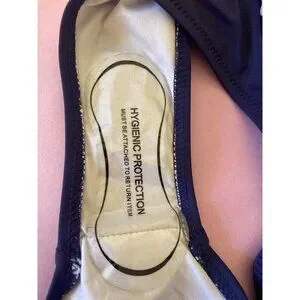 This swimsuit offers a flattering halter neckline with padded cups for support. Its navy and white striped design exudes timeless style.