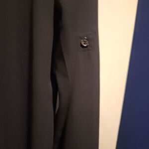 100% polyester, surplice neck line, hi-lo hem, long sleeves w roll-up tabs, single button detail on front.