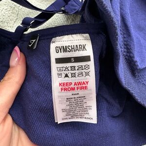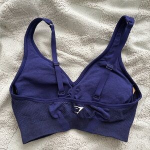 This Gymshark sports bra in a striking blue hue offers a supportive fit with its wide shoulder straps and under-bust band. Crafted from a stretchy, athletic material, it features a V-neck design and a subtle logo for a sleek, functional look.