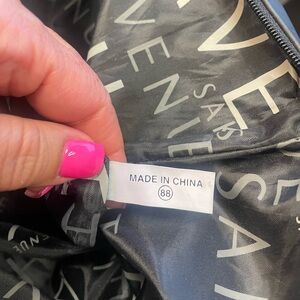 Sleek black tote by Saks Fifth Avenue with zipper details and Saks Fifth Avenue charm accents. Material of tote feels rubbery so very durable and easy to clean, good used condition