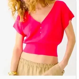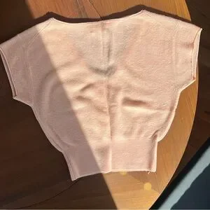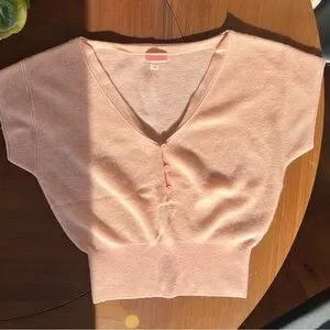 Beautiful and light weight JCrew cashmere sweater- with v neck and 3 button detail. Sleeves drape beautifully off the shoulder in cap sleeve- slightly fitted at the bottom. Color is beautiful shade of peach/ apricot (fuscia shown to see how it looks on). Worn only once or twice.