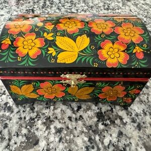Russian jewelry box hand painted in the unique Khokhloma style. Khokhloma painting on wood is a traditional type of Russian decorative work that was started in the second half of XVII century on the territory of what is today called Koverninsky region of Nizhnii Novgorod oblast
