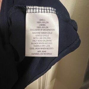 100% nylon. Lightweight and stretchy fabric with a stretchy liner. Very flattering cut and cute pattern.