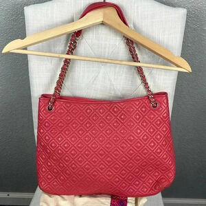 Tory Burch Marion Quilted Chain Slouchy Satchel Tote In Peony Bag Purse Chain