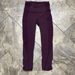 In very good preowned condition Lululemon maroon side scrunch workout leggings in size 4. No size tag, but sticker pictured. No piling or flaws!