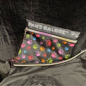 Colorful paw print shoulder bag with a zipper pocket. Features a paw charm and 'Paws Galore' branding. eUC include small bag