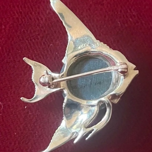 Vintage 14K Gold Jade Cabochon Ruby Eyes Fish Brooch