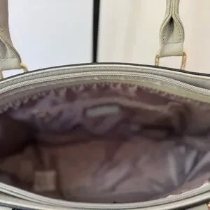 This elegant gray satchel features a structured design with gold-tone metal accents, offering a sophisticated look for any occasion. Its spacious main compartment and double top handles make it both stylish and functional. The bag's neutral color ensures versatility, easily complementing various outfits.