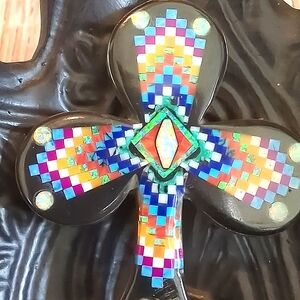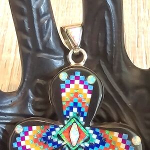 ✨🌠 Incredible Inlaid pendant with genuine natural gemstones including but not limited to turquoise, lapis, spiney oyster, black onyx. Lab created opal