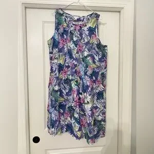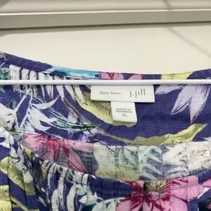 Vibrant floral sleeveless dress with a mix of purple, green, and pink hues. Perfect for a casual outing. J Jill Dress Womens XL Love Linen Pleated Floral Tropical Resort Pocket Beach machine washable EUC. Non smoking home. Personal closet. Gently worn. Hung to dry. Chest measures 25 inches across