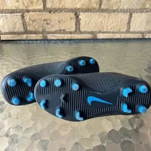 Sleek Nike soccer cleats in black and gray. Features blue accents on the sole. Ideal for performance.