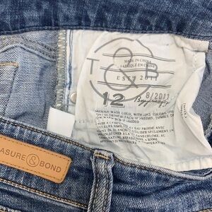 Treasure & Bond denim shorts. Distressed markings on front. Five pocket and frayed legs