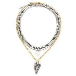 Elevate your style with this stunning layered necklace featuring a striking lightning pendant. The combination of gold and silver tones adds a touch of elegance to any outfit.