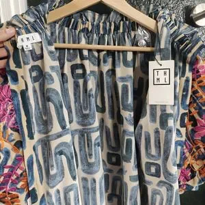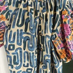 Stylish THML shirt with a vibrant multicolor pattern. Features shades of blue, cream, and tan. Puffy sleeves with gorgeous embroidery. Buttons up in back.