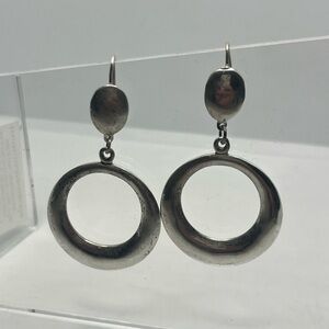 Modernist sterling silver disc hoop dangle earrings vintage. These are in used condition. They are tarnished and scratched. They will need to be polished. They are dirty also. See all photos for details and measurements.