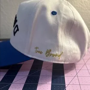 Classic cap with 'True Brvnd' branding. Features a white crown and blue brim.