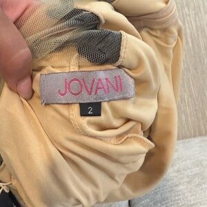This exquisite gown by Jovani showcases a sophisticated tan and cream palette with a daring plunge neckline. Ideal for prom or as a wedding guest, the sleeveless design offers a graceful silhouette perfect for any elegant occasion.
