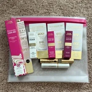 Grande Cosmetics bundle - Grande Lash-md full size (3 month supply $68) & sample/travel 4 week supply, sample/travel grand primer white pre-mascara, grande mascara conditioning peptide mascara in rich black, grande primer fortified with last plumping peptides (sealed with no box), grande lips hydrating lip plumper ($28), clear, also no box. Plus clear zip travel bag