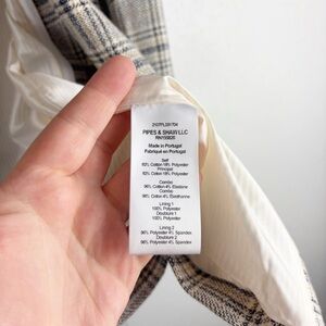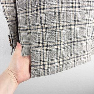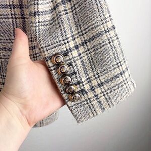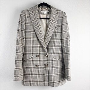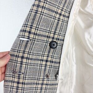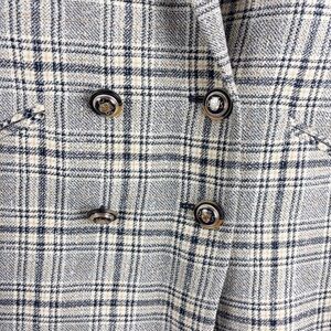 Double breasted button details, plaid, notch lapel collar, long sleeve with button cuffs. Interior zipper for Dickey attachment. Cotton blend. Lined. Black, white, cream/tan. Casual, work, dressy, professional, career, suit, tailored, business.