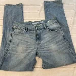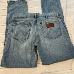These Wrangler jeans offer a timeless straight leg fit in a classic blue hue, perfect for everyday wear. The denim's slightly faded appearance adds a touch of casual elegance, making them a versatile addition to any wardrobe. Enjoy the comfort and durability that Wrangler is known for with these essential jeans.