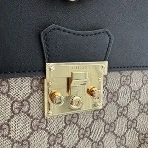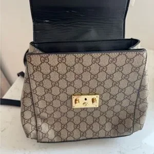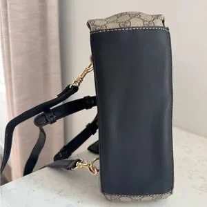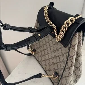 This inspired backpack features a striking combination of black leather and tan GG monogram pattern, accented by a luxurious gold-tone chain detail. Its structured design offers a perfect blend of elegance and versatility, making it suitable for any occasion.