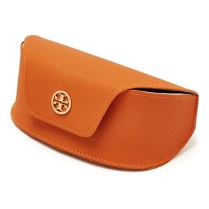 Chic orange case with signature Tory Burch emblem. Ideal for stylish eyewear protection.