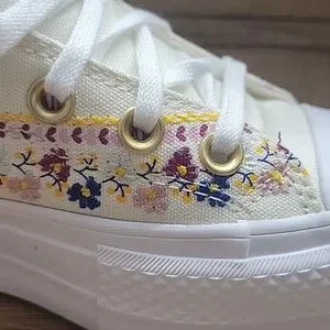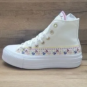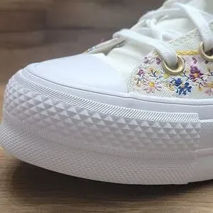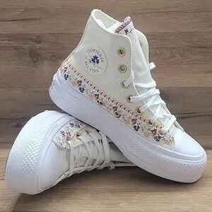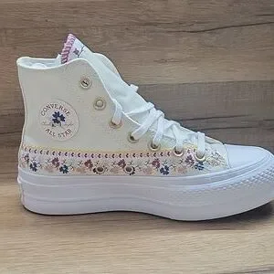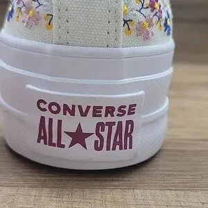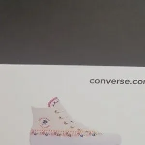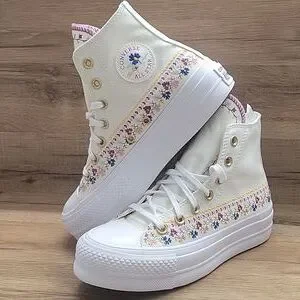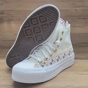 Experience timeless style with these Converse high-top sneakers, featuring a crisp white color and the iconic Chuck Taylor silhouette. The shoes boast a durable rubber toe cap and sole, ensuring both comfort and longevity. Perfect for any casual occasion, these sneakers effortlessly blend classic design with modern flair. Converse platform High Top Brand new in the box no lid authentic uper textile size women's 5.5.