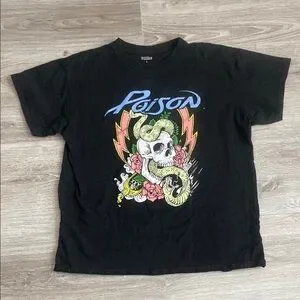 Black t-shirt featuring a Poison graphic band data with a skull and snake design. Short Sleeves. Perfect for any fan. Size L. Smoke free pet friendly home.