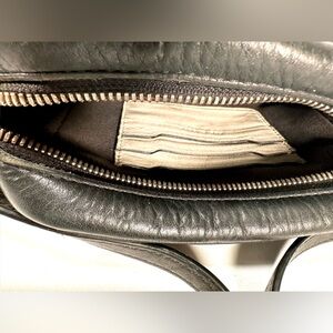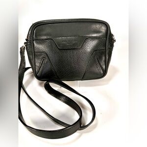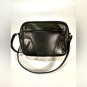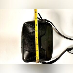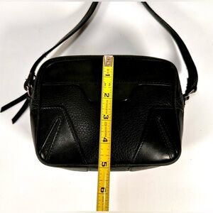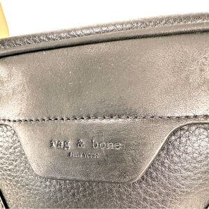 The image shows a black leather crossbody bag from Rag & Bone. It has a rectangular shape with a zippered top and a long, thin strap. The bag appears to be made of textured leather with a smooth panel on top. Rag & Bone is known for its downtown-inspired designs and quality craftsmanship.