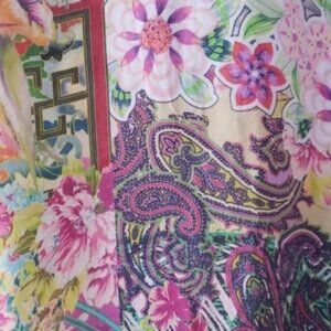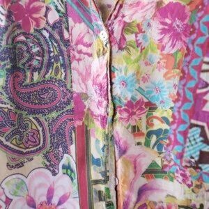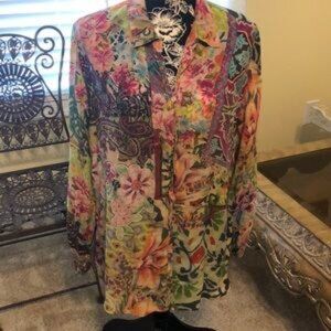 Long sleeve button down by Johnny Was. Beautiful Jewel tones. Button tab sleeve if you'd like to roll the sleeves. In great pre-loved condition .. no stains. It could be steamed as it is wrinkled around button areas and in between .100% Cupra rayon and washable. Size M with flat measurements of Bust: 21" and Length: 30".