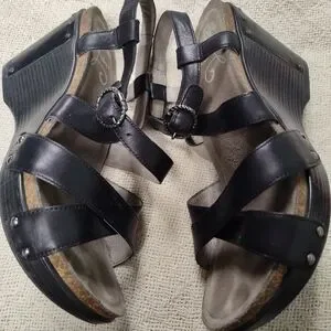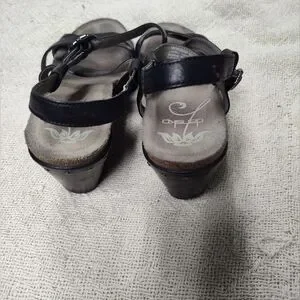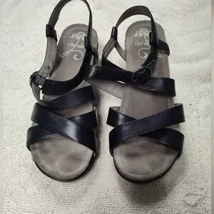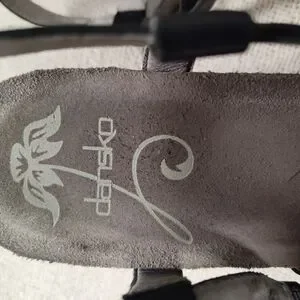 Experience the perfect blend of style and comfort with Dansko's black strappy sandals. Featuring a minimalist design with matte black straps and a cushioned footbed, these sandals are ideal for both casual and semi-formal occasions. The adjustable ankle strap ensures a secure fit, making them a versatile addition to your wardrobe. It says size 41 which is UK and a size 10 in the US.