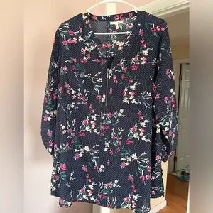 This is a gorgeous blouse with a button detail on the sleeves. Beautiful flower pattern. This top can easily be worn casual with jeans or business casual with dress pants to go to work. Size XL. Great condition and without any flaws.