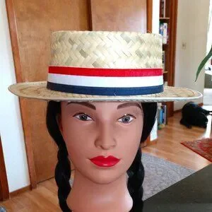 100% STRAW PANAMA PATRIOTIC SKIMMER BOAT HAT RED WHITE BLUE RIBBON WIDE BRIM