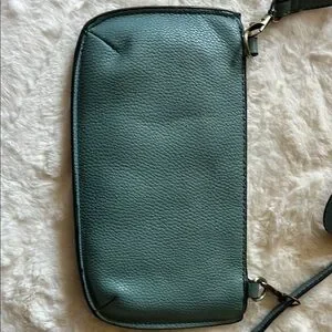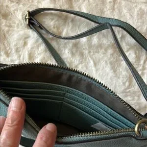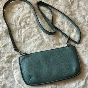 This stylish green leather crossbody bag is perfect for any occasion. Its sleek design and high-quality material make it a must-have accessory. Elevate your outfit with this versatile piece. Great to carry the basics for any event. Features polished Turlock, six card slots and interior zipper. Measurements: height 5”, width 9.5”, 1” deep.