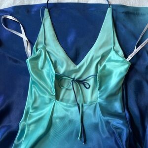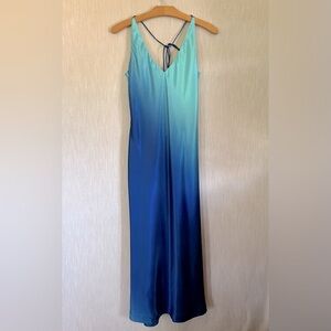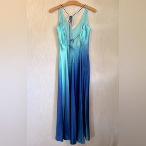 Stunning, slinky midi dress in a gorgeous ocean of blues. Delicate straps tie at neck and back. Fitted at bust and waist, gradual flare to hem.