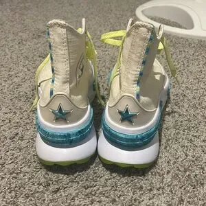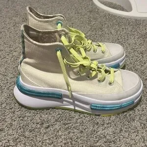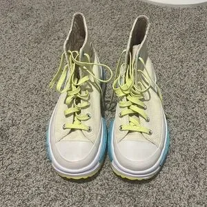 These are some chunky limited edition converse! Great colors for the summer, if you don’t mind a little heft in your step. I’ve never worn these, but there are some scuffs as pictured I suppose from moving that might be able to be buffed out. Not super noticeable unless looking closely. Let me know if you have any questions!