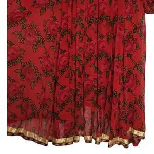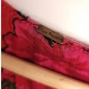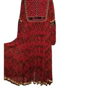 Easy-breezy maxi dress from American alterative label Free People. Mixed prints in a loose and relaxed fit. Topped with an embroidered v-neck bib and embroidered long capped bell sleeves. Finished with metallic trim at the high/low hem.