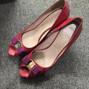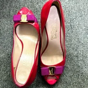 Experience luxury with these Salvatore Ferragamo heels, showcasing a striking red and purple color-block design. Crafted from a soft suede-like material, they feature a chic peep-toe and elegant gold-toned embellishments, perfect for adding a touch of sophistication to any occasion.