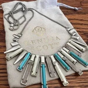 This exquisite Kendra Scott necklace showcases a striking geometric design with alternating silver bars and blue stones. The fan-like arrangement creates a captivating graduated effect, making it a standout piece for any occasion. Suspended on a sleek silver chain, this necklace embodies modern elegance and architectural flair.