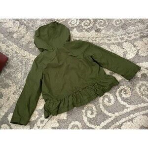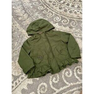 Cute jacket from Old Navy! Great Olive green water proof outer material, soft pink knit lining, hood, zipper and snap closure. Great for cooler temperatures or a bit of rain