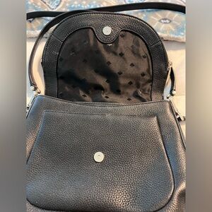 8.3"h x 10.7"w x 3.5"d handle drop" 10.5 drop: 22" pebbled leather two way spade jacquard lining shoulder bag with flap closure one interior zip pocket one interior slide pocket zip pocket on flap metal pinmount logo optional (and adjustable) strap