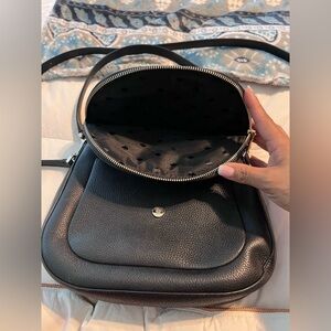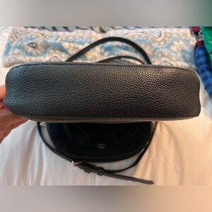 This sophisticated black shoulder bag from Kate Spade features a sleek, minimalist design with a curved flap closure and gold-tone hardware. Its medium size and structured silhouette make it a versatile choice for both day and evening use.