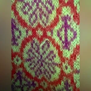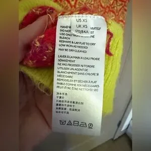 Bright knit sweater with a bold pattern. Super soft. Features a V-neck and short sleeves. Perfect for adding color to your wardrobe. There is a small snag (see photo). New with tags. Size XS but fits oversized.