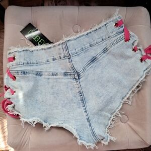 These Dolls Kill jean shorts feature a stylish pink lace up sides for adjustable sizing and sexy hip baring skin showing, highlighted by a distressed, frayed hem for a trendy, casual vibe. The high-waisted design and pink embellishments add a unique touch to these standout shorts, making them perfect for a fashionable day out. Very cheeky!!! sexxxy! new with tags!