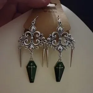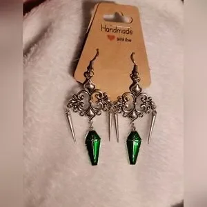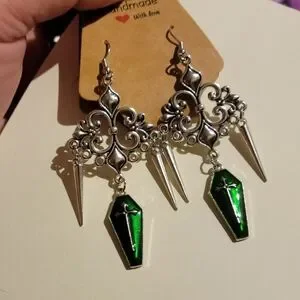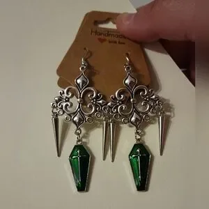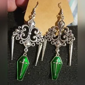 Green Coffin Dangle Earrings w/ Silvertone Spikes Gothic Handmade Punk Emo Goth