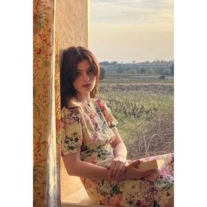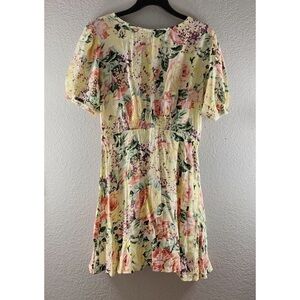 Breezy woven fabric, in an allover yellow, green, pink, and purple floral print, shapes this flirty dress with a rounded neckline and relaxed-fit bodice, framed by short puff sleeves with fitted cuffs.